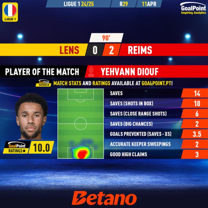 对阵朗斯的比赛以兰斯2-0战胜对手结束,这是一场保级关键战。兰斯的香槟军团在整场比赛中死守,而队长迪乌夫的14次扑救功不可没,其中包括10次禁区内扑救和3.53的阻止进球数。
